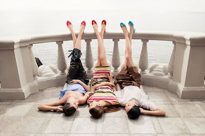 In one image, a trio of women lie on a balcony overlooking the sea, their feet leaning against the railing in front of them. They are captured seemingly in deep conversation, sharing confidences with friends.