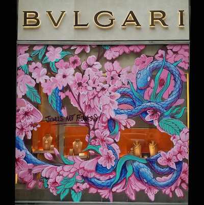 This is the first global street art display curated by the brand. Each of the windows is different, with Bulgari tapping a different street artist to tag the panes in each city.