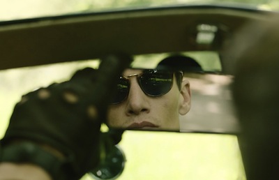 As the driver revs the engine, the narrator introduces the first rule, safety checks to ensure the vehicle’s mirrors are properly adjusted. The driver is then shown checking his reflection in the rearview mirror, adjusting his dunhill shades and smoothing his hair.