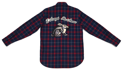 The exclusive capsule consists of four pieces. For the collection, Mr. Michele designed a cotton crew neck with a tree design, a pair of check pajama pants, a check flannel button-down shirt with a rabbit patch on the back and a denim jacket with a patch, intarsia and metal studs.