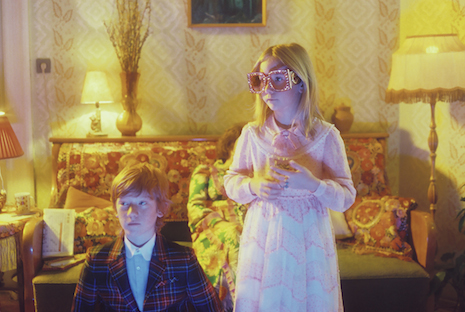 When the grandmother falls asleep on the couch wearing a pair of bedazzled frames, the children take over, popping a tape into a VCR. Mimicking the moves of a female guitarist on the screen, the girl takes off her grandmother’s eyewear to further achieve a rock star look.