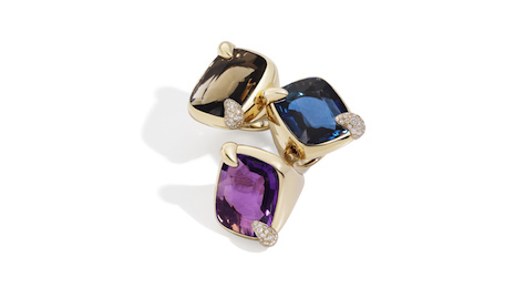 Ritratto includes three sizes of rings, earrings and pendants featuring the brand’s signature colorful stones such as topaz, amethyst and smoky quartz. Priced between $2,865 for a pendant and $10,611 for the largest sized rings, the collection will be available in-store this April.