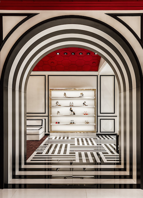 Inside, Aquazzura has selected a deep red and inlaid marble floors with black-and-white stripes to bring its own style to the space. This flooring design has been included in all Aquazzura boutiques worldwide for a consistent brand experience.